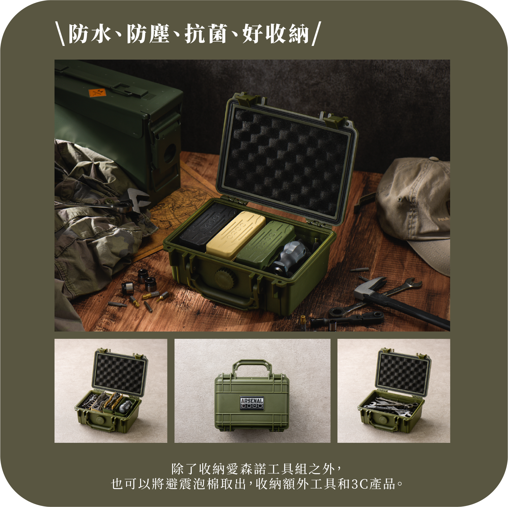包含軍綠、礦黑、沙漠組套、氣密箱各一。