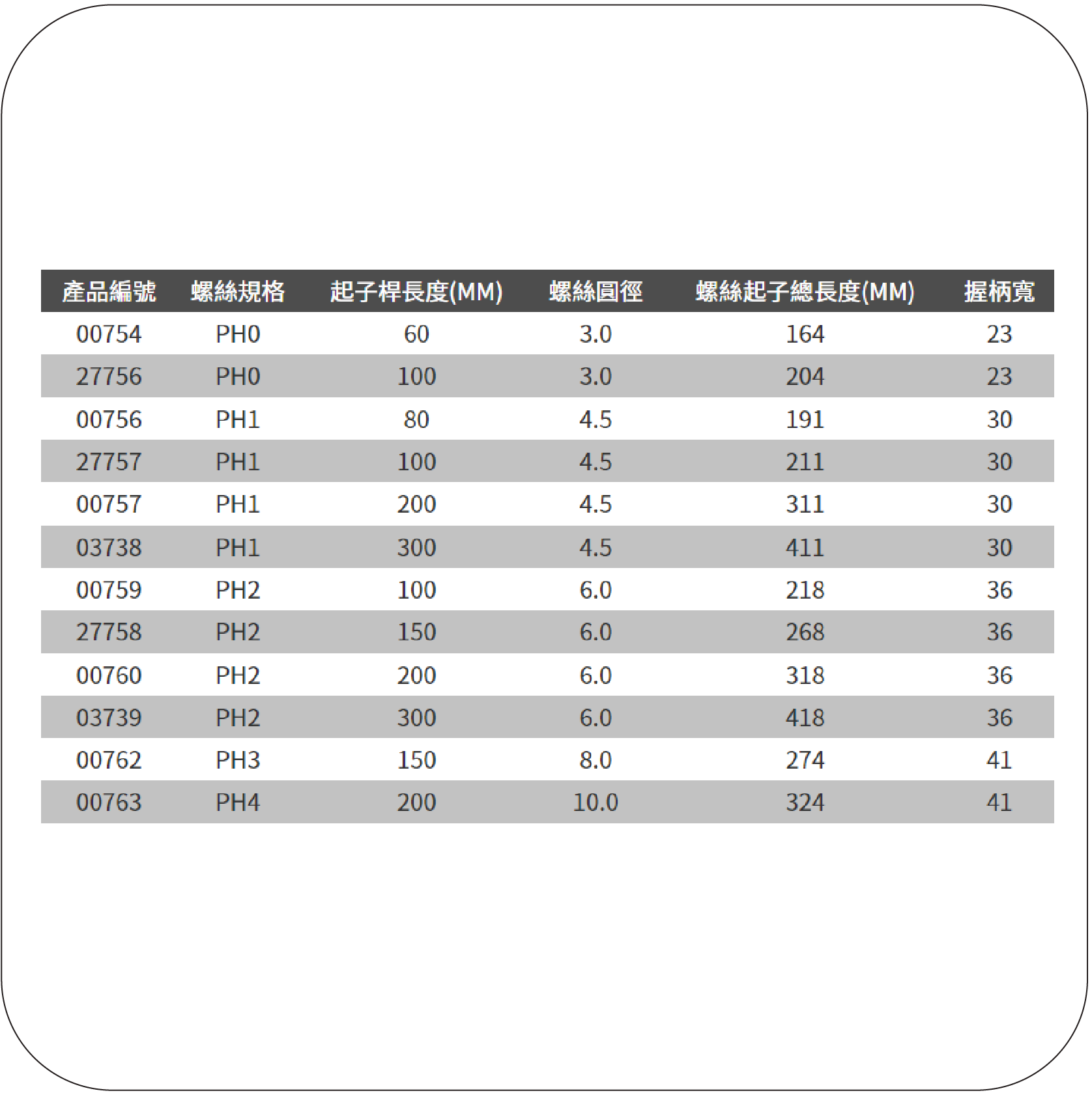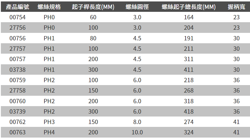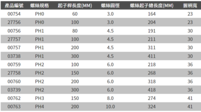 PH0 x 60L, PH0 x 100L, PH1 x 80L, PH1 x 100L, PH1 x 200L, PH1 x 300L, PH2 x 100L, PH2 x 150L, PH2 x 200L, PH2 x 300L, PH3 x 150L, PH4 x 200L