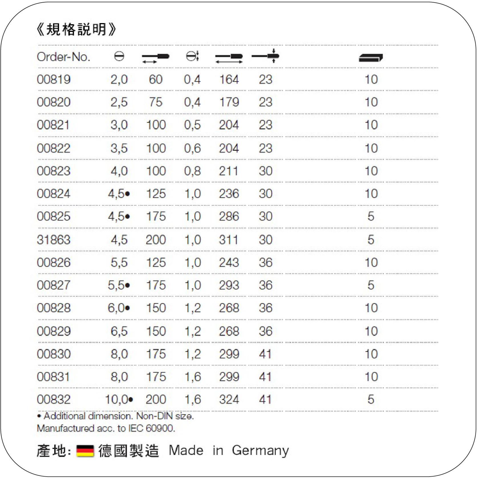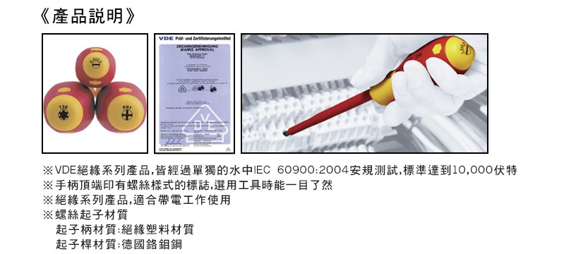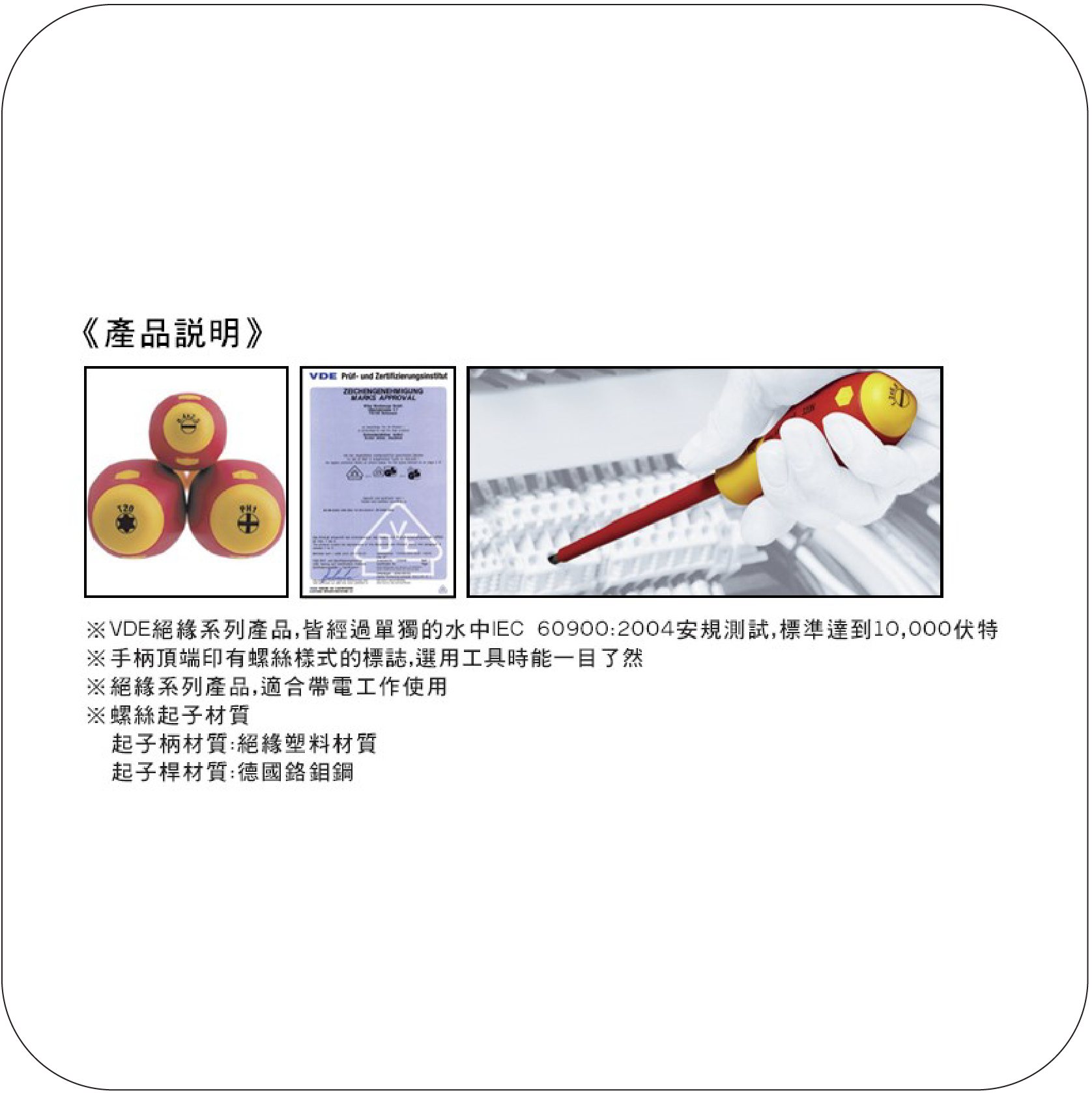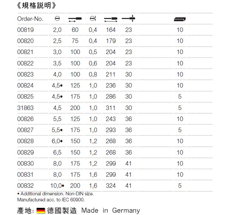 絕緣一字2.0×60L, 絕緣一字 2.5 x 75L, 絕緣一字 3.0 × 100L, 絕緣一字3.5×100L, 絕緣一字4.0×100L, 絕緣一字4.5 x 125L, 絕緣一字4.5 x 175L, 絕緣一字 5.5 x 125L, 絕緣一字5.5 x 175L, 絕緣一字 6.0x150L, 絕緣一字6.5× 150L, 絕緣一字8.0x 175L, 絕緣一字 10.0x 200L, 絕綠十字 PH0 x 60L, 絕緣十字 PH1 x 80L, 絕緣十字 PH2 x 100L, 絕緣十字 PH3 x 150L, 絕緣十字 PH4x 200L