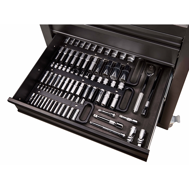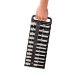 1. 3/8" Drive插座收納 2. 可放14 個標準套筒和 14 個長套筒 3.超強磁吸 4. 耐衝擊塑膠 5. 便利手柄