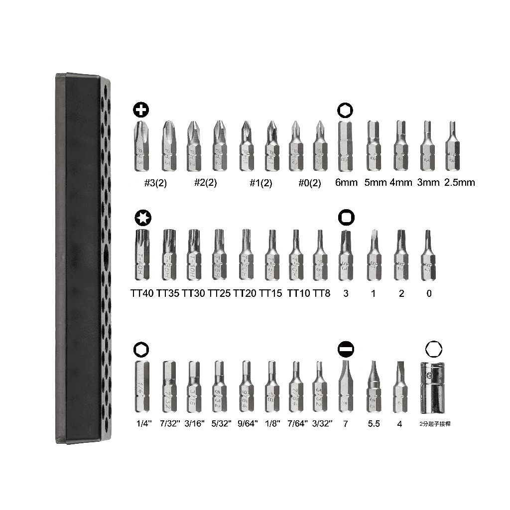 5. 內含起子: 十字#0(2),#1(2),#2(2),#3(2)/一字4,5.5,7mm/星型TT8,TT10,TT15,TT20, TT25,TT30,TT35,TT40/四角0,1,2,3/六角2.5mm,3mm,4mm,5mm,6mm,7/64",1/8",9/64",3/32",5/32",3/16",7/32",1/4" / 2分起子接頭