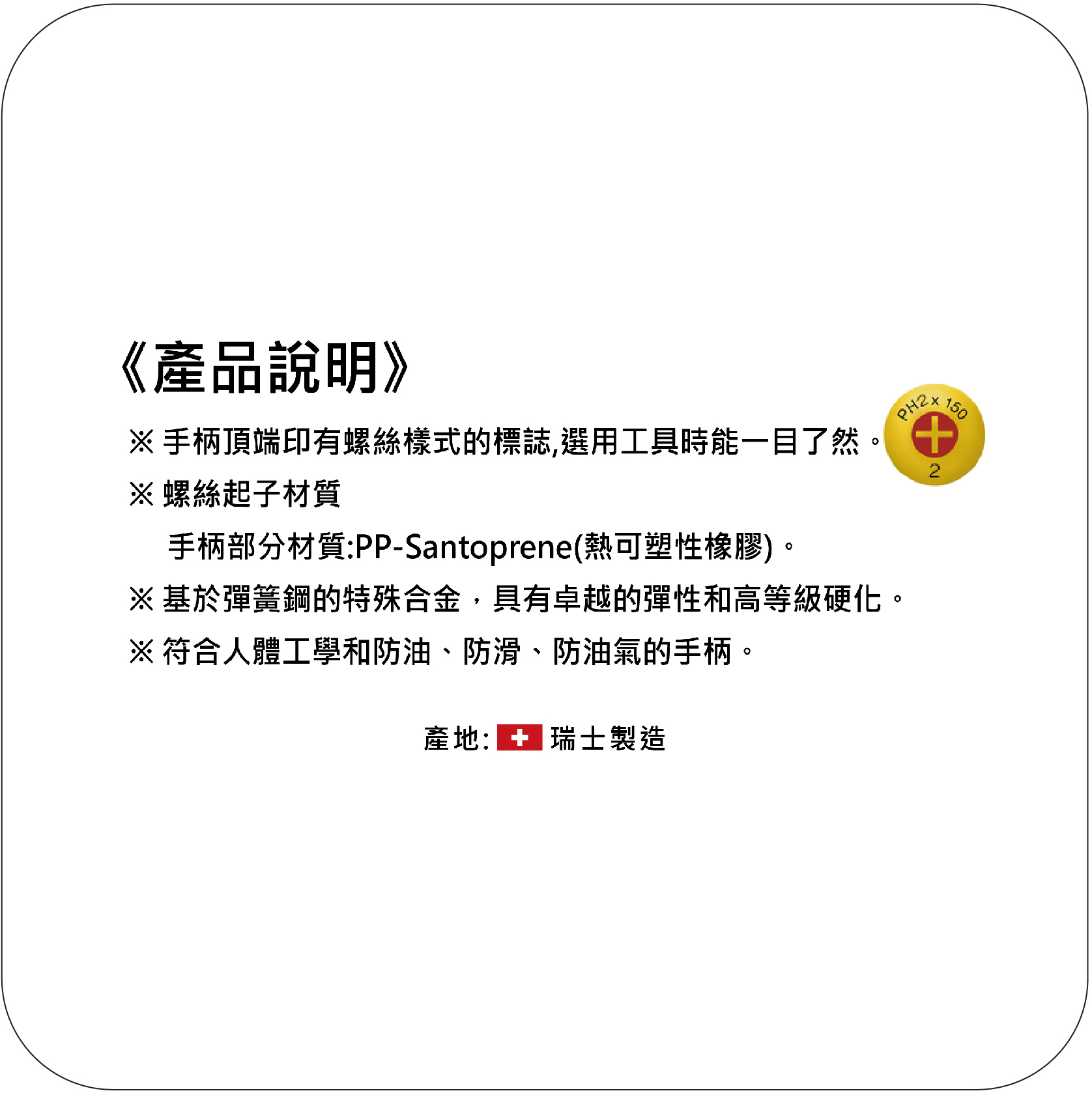 手柄頂端印有螺絲樣式的標誌,選用工具時能一目了然。 螺絲起子材質 手柄部分材質:PP-Santoprene(熱可塑性橡膠)。 基於彈簧鋼的特殊合金,具有卓越的彈性和高等級硬化。 符合人體工學和防油、防滑、防油氣的手柄。 產地:瑞士製造。