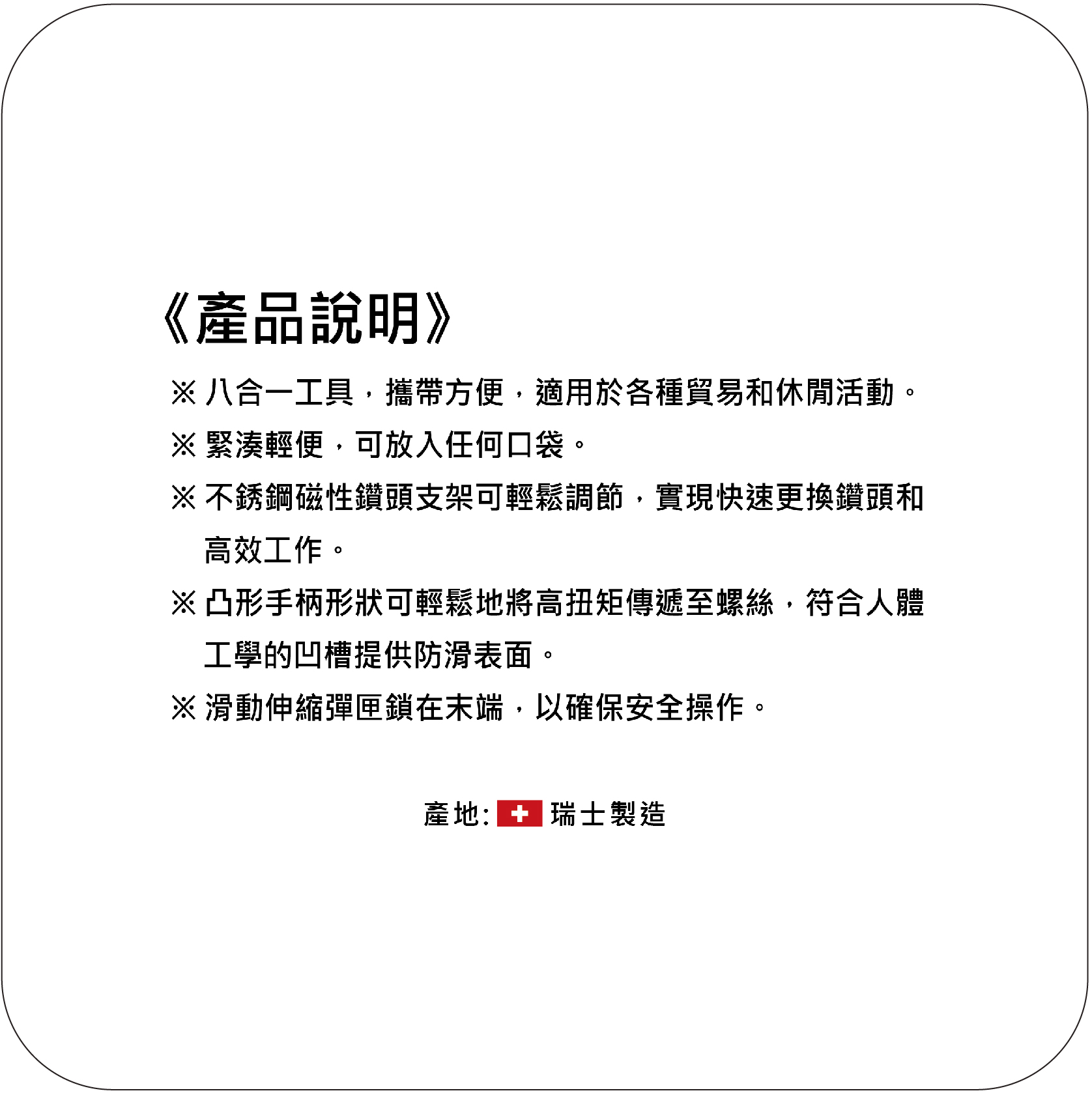 八合一工具,攜帶方便,適用於各種貿易和休閒活動。 緊湊輕便,可放入任何口袋。 不銹鋼磁性鑽頭支架可輕鬆調節,實現快速更換鑽頭和高效工作。 凸形手柄形狀可輕鬆地將高扭矩傳遞至螺絲,符合人體工學的凹槽提供防滑表面。 滑動伸縮彈匣鎖在末端,以確保安全操作。