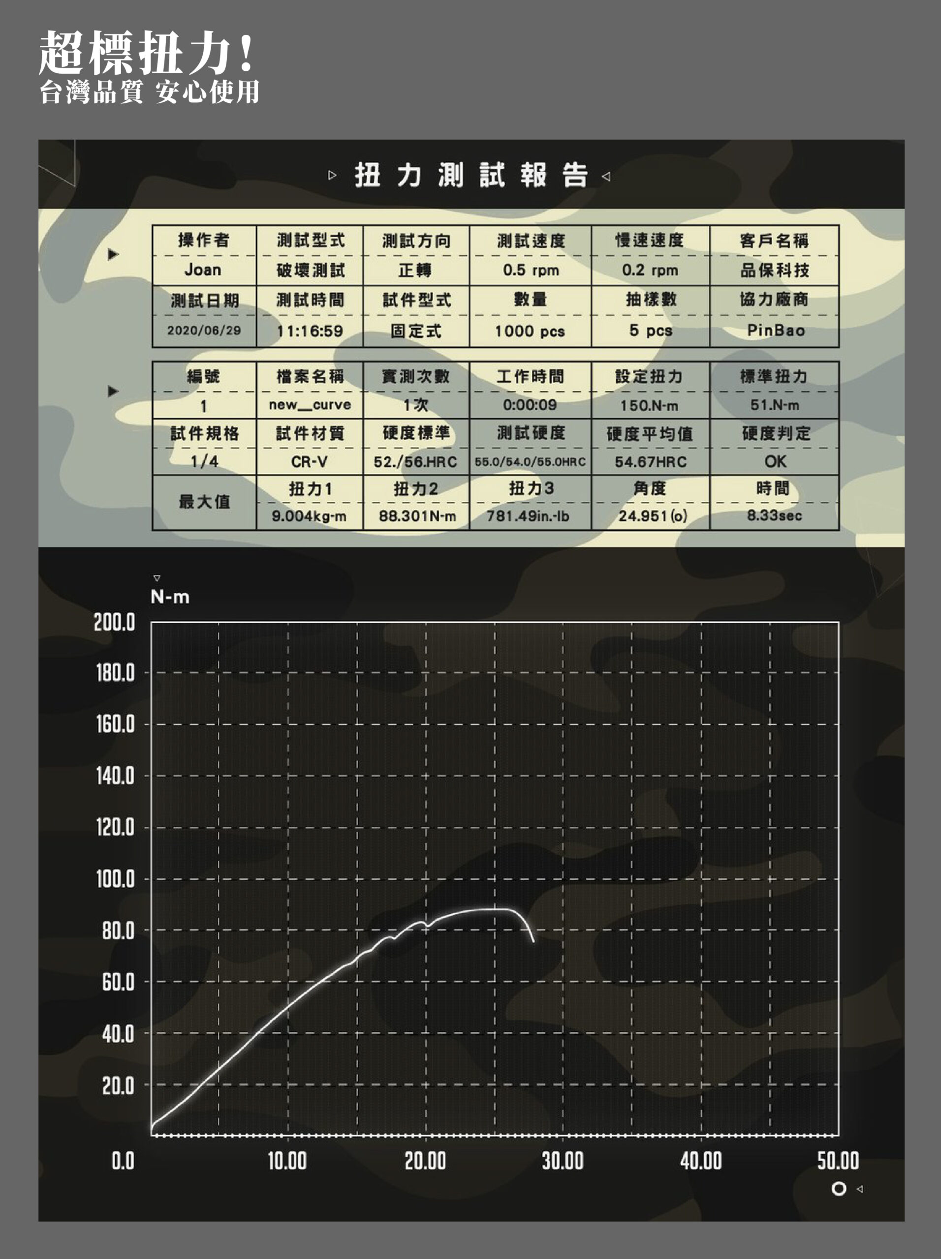 以一枝2分葫蘆柄來說,ANSI規範為52牛頓米,我們將最高標輸出設定150牛頓米,看看台灣製能耐在哪裡!而這次的試驗結果為 88牛頓米 ,以標準值來說達到了1.7倍。