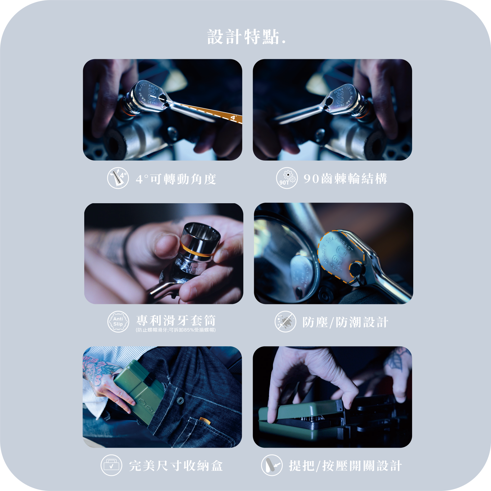 - 棘輪柄採用防塵蓋設計,有別於傳統扳手易卡灰塵、黑油導致結構損壞。