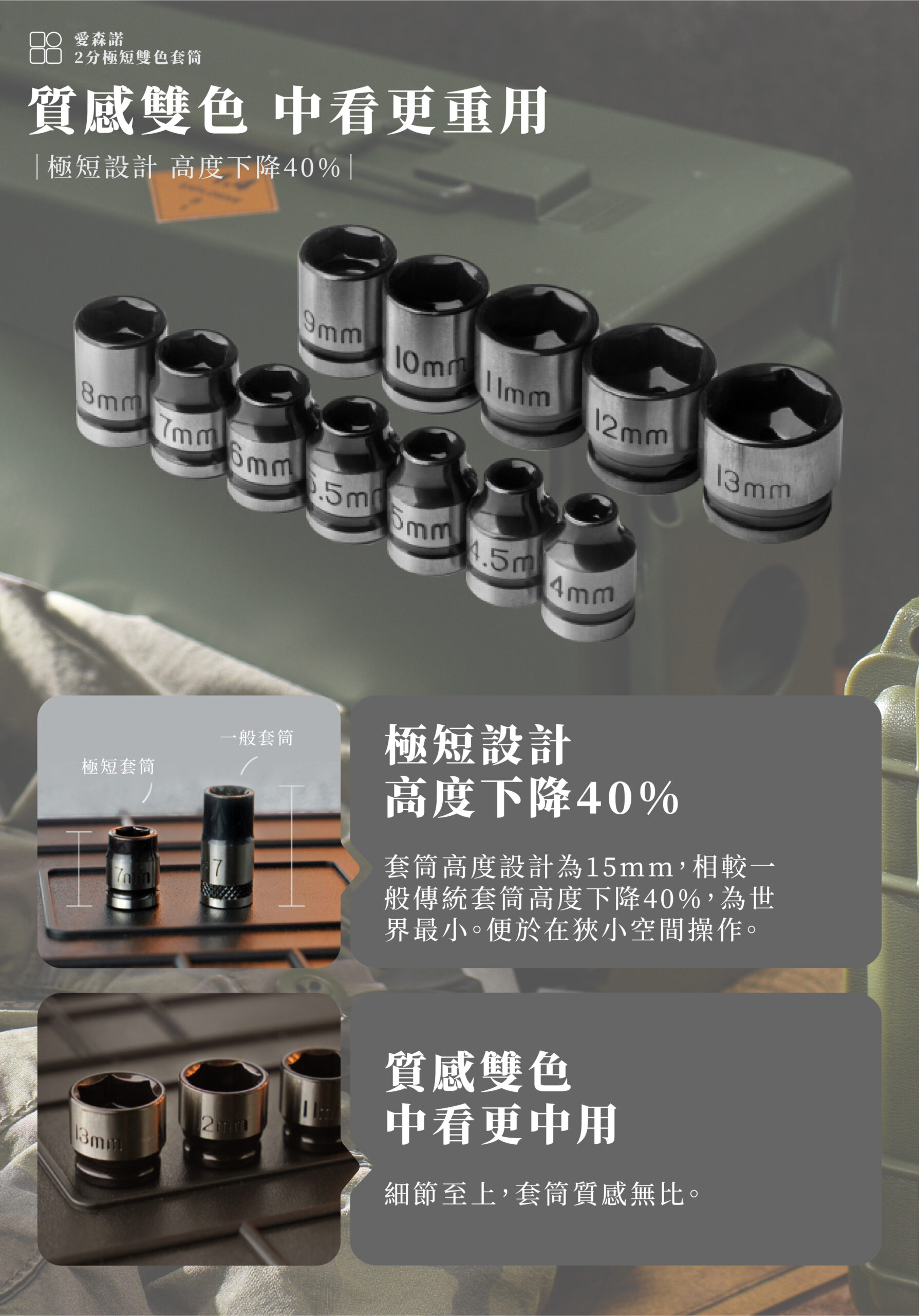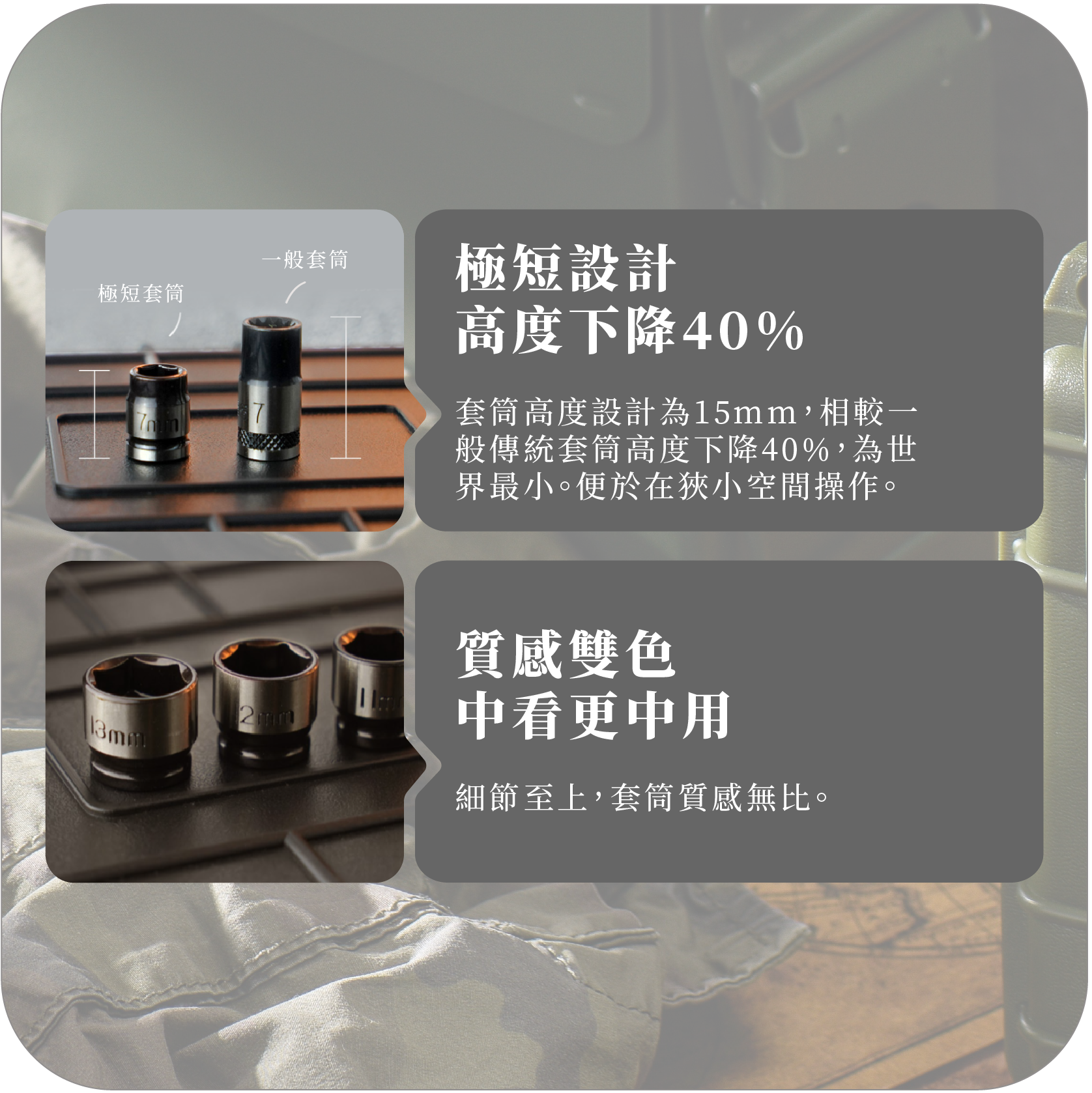 較傳統套筒下降40%高度 ┃ 高級絡釩鋼 ┃ 雙色造型帥氣滿分 ┃ 100%台灣製作 *14mm無法收納進小鐵盒內