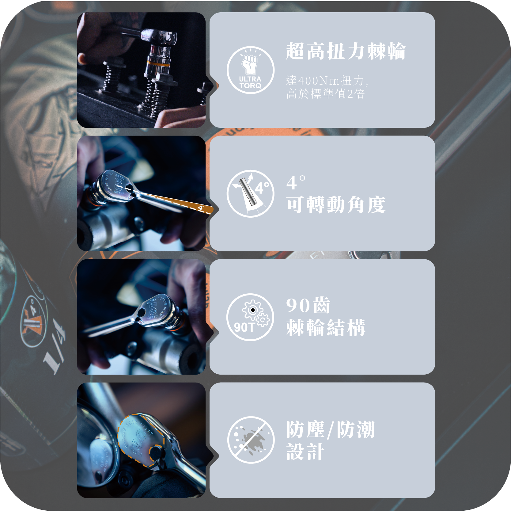 1. 90齒綿密棘輪機構,創造出 4度的轉動角度。便利於在狹小空間內快速拆鎖螺帽。 2. 超扭力 Ultra Torq Tech 棘輪機構創造出高於標準值2倍的扭力。(實測破壞扭力高達300Nm) 3. 棘輪柄採用防塵蓋設計,有別於傳統扳手易卡灰塵、黑油導致結構損壞。
